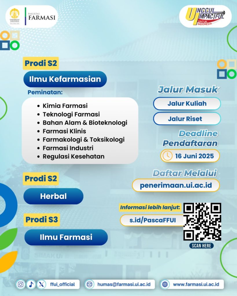 Depok, 26 Mei 2025 – Fakultas Farmasi Universitas Indonesia (FFUI) kembali membuka Penerimaan Calon Mahasiswa Baru Program Pascasarjana untuk Tahun Akademik 2025/2026 melalui jalur SIMAK UI Gelombang 2. Tiga program studi unggulan ditawarkan, yaitu: